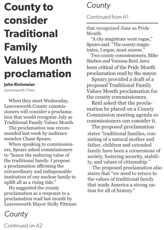 Leavenworth Times / July 15, 2025 / County to consider Traditional Family Values Month proclamation (pp. A1-A2 in Print Edition)